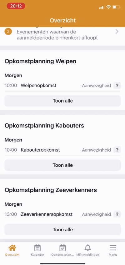 Bekijk de opkomstplanning makkelijk en meld je simpel af met één druk op de knop. Ga naar ‘Opkomstplanning’ in de app, tik op de opkomst en geef je ‘aanwezigheid’ door. Aanmelden is niet nodig, alleen afmelden.