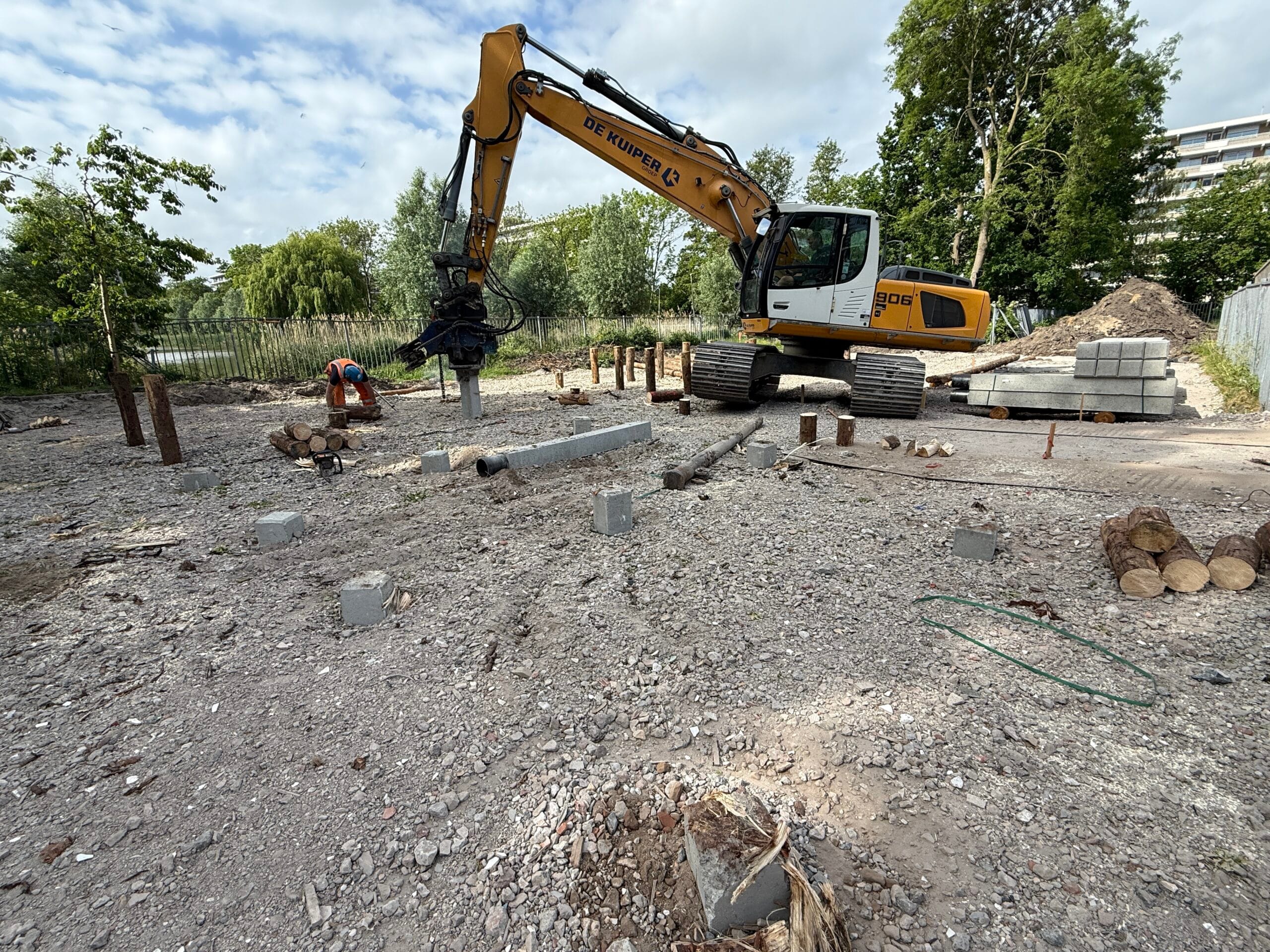 Vandaag zijn alle heipalen in de grond gedrukt. Eerste houten palen met daar bovenop betonnen palen. Wat een brute kracht!